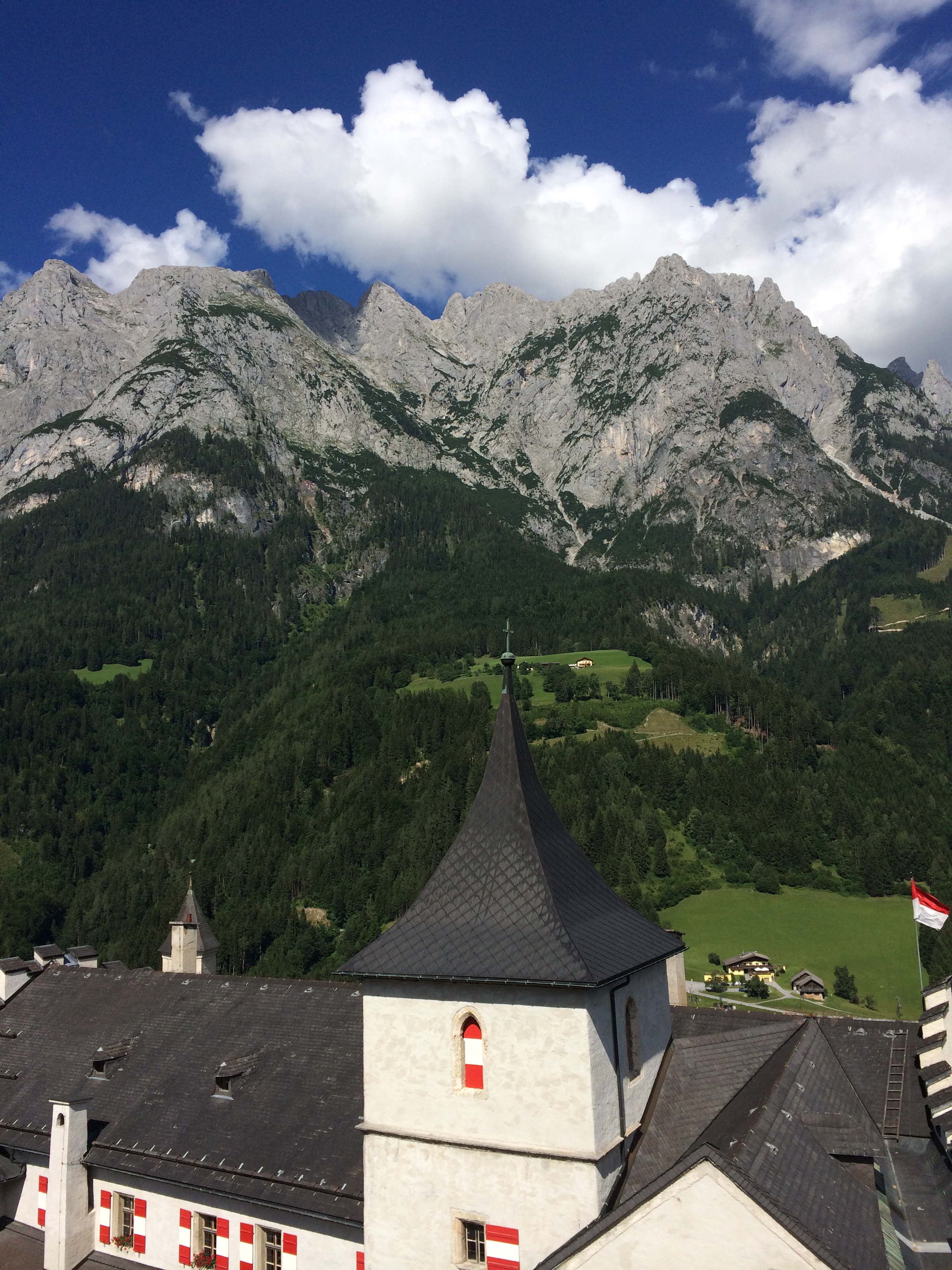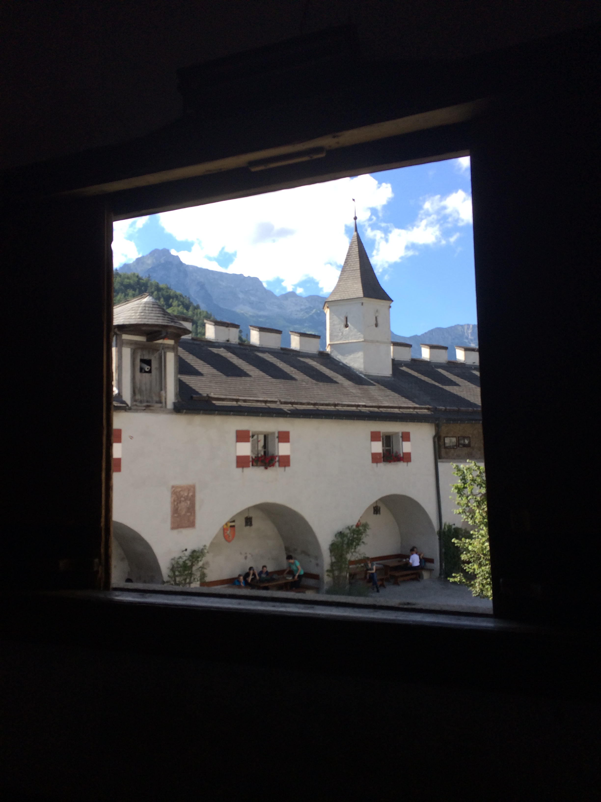 This is the incredible fortress of Hohenwerfen Castle. The town of Werfen, Austria lies far below. It is surrounded by the Berchtesgaden Alps. I had a tour there and attended a Falcon Show by the Historic State Falcon Court. The view of the Salzachtal Valley of Austria was improved only by the sight of these beautiful birds soaring overhead. The Falcons were released above my head by the castle. They flew down to the Falconer and soared incredibly far and high. They were only too happy to come back to their meal. They walked by me less then 2 inches on their way uphill to the castle. One was released and he flew so close to me, I can still hear the whoosh of his wings in my ears. The Castle is incredible. I had a tour of the pitch kitchen, the armory, other parts of the castle, and the Bell Tower, whose bottom floor was a dungeon. It’s now a gift shop! The fortress has stood for over 900 years, seen a lot of seiges, and held a lot of prisoners. It’s view is beautiful….. it’s history fascinating….