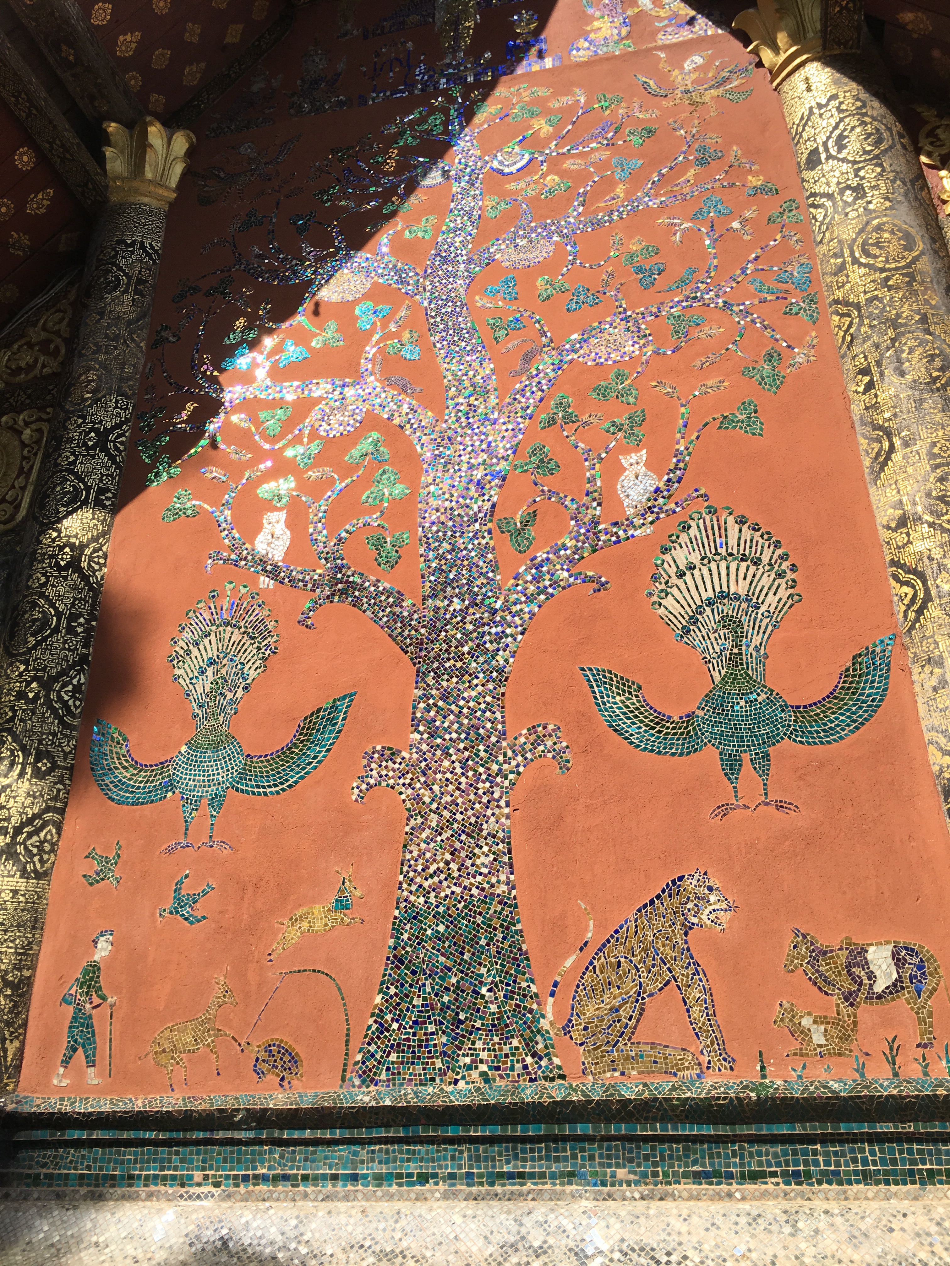 Very close by is the amazing temple complex with Wat Xieng Thong. The Tree of Life is on one side of it. There’s a beautiful mosaic tiger and so many other decorations on it. Walking through the temple complex is so amazing. The stupas are all around the temples. Stupas are mound shaped and they contain relics or the remains of the Buddhist monks.