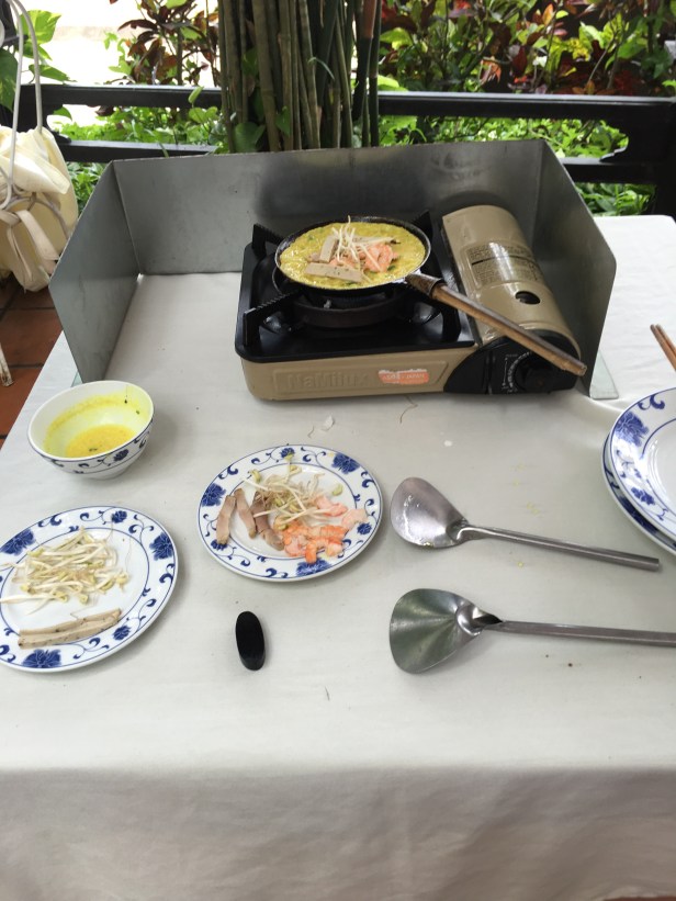 After seeing the market the tour stopped at Brother’s Cafe. A culinary cooking lesson awaited us all. Brother’s is in an old French Police Compound right on the Main Street. The back of it opens onto the Thu Bon River.