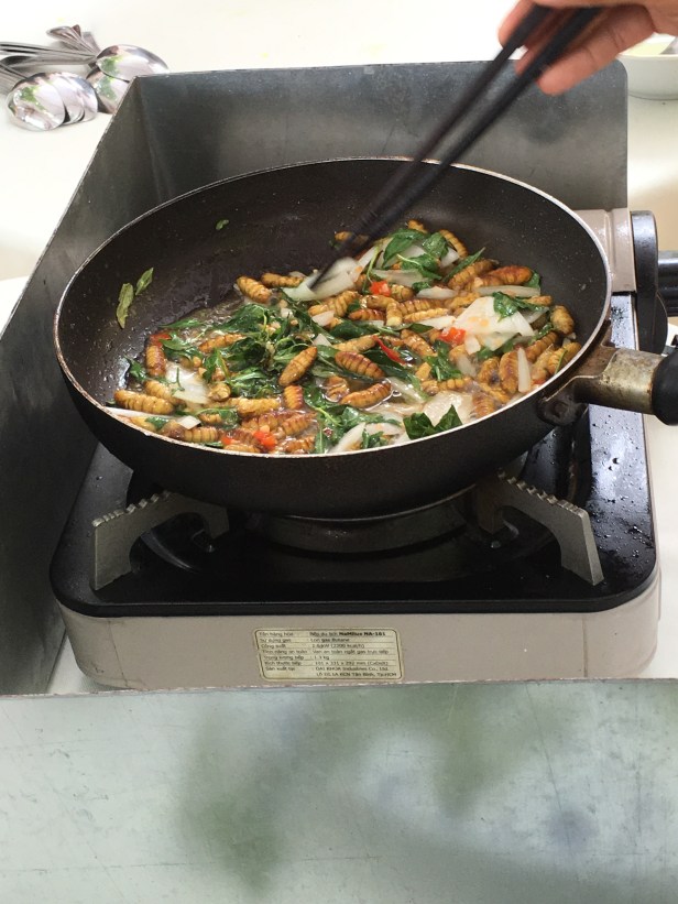 I learned to make rice paper rolls, Hoi An Pancakes, and a mouthwatering stew! I even tried their specialty below: YES, those really are MEALY WORMS.