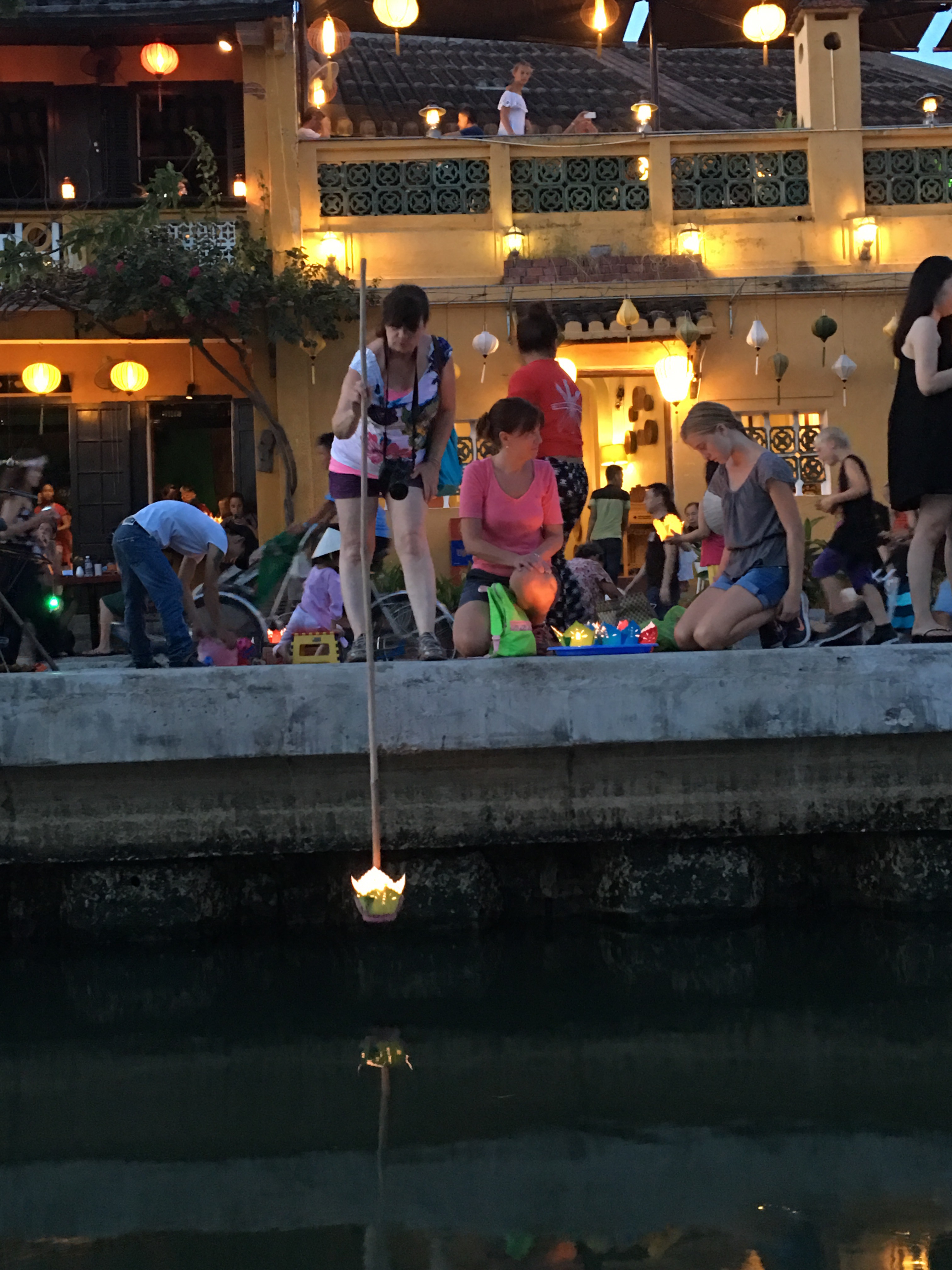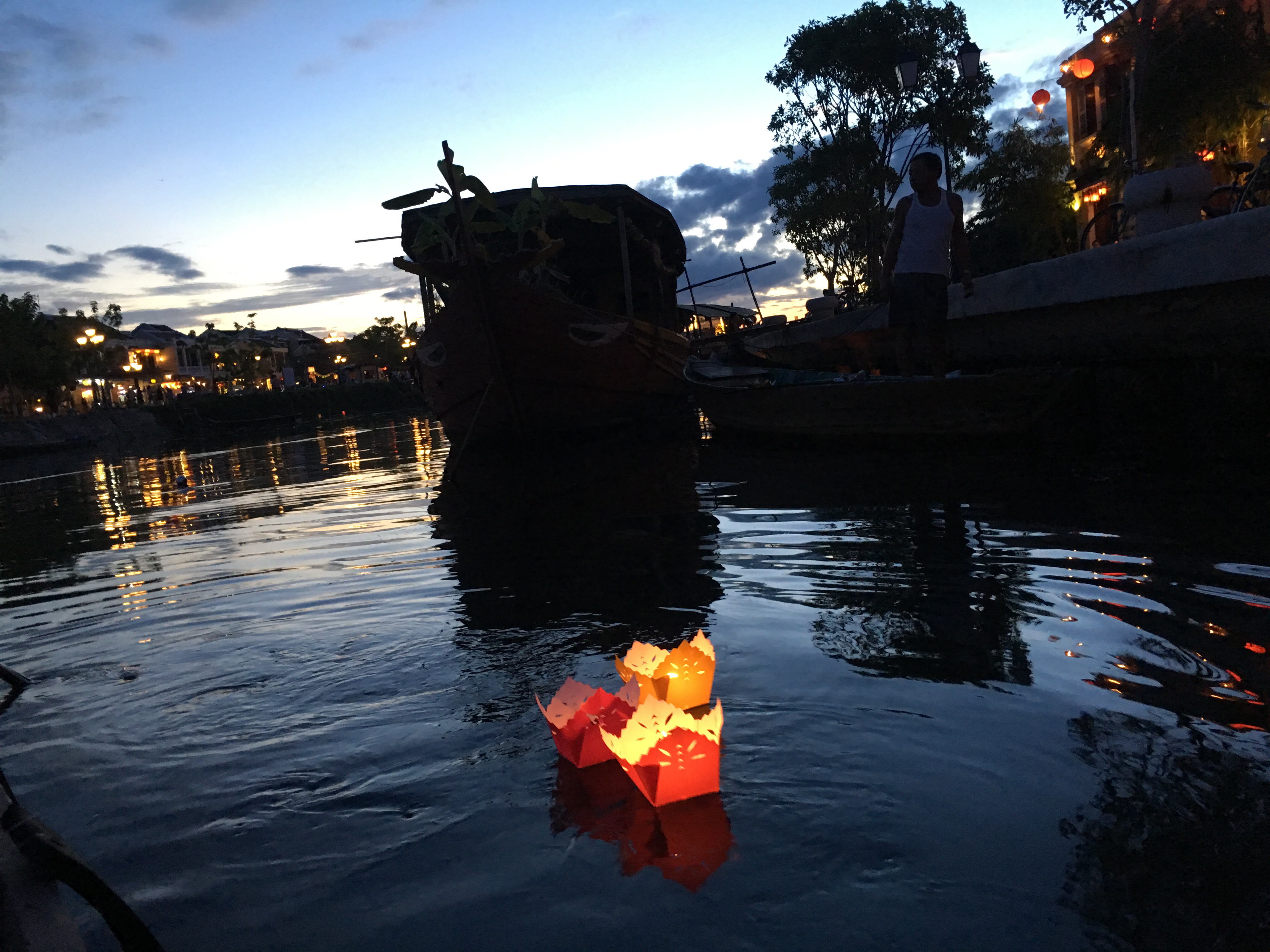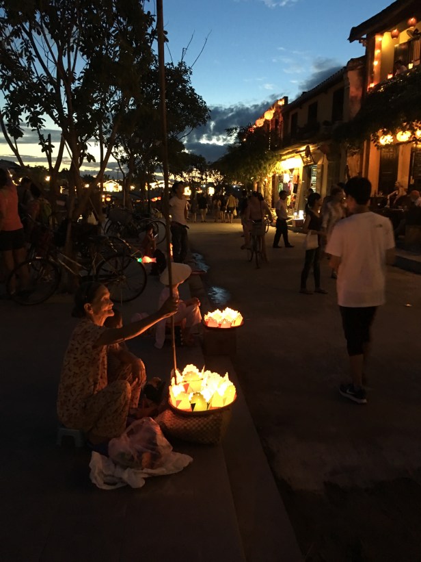 The sun was setting on the Thu Bon River, and locals were already selling their wares. Food and vegetables turned to lit candles and a night market. The streets were all aglow with lanterns and lights.