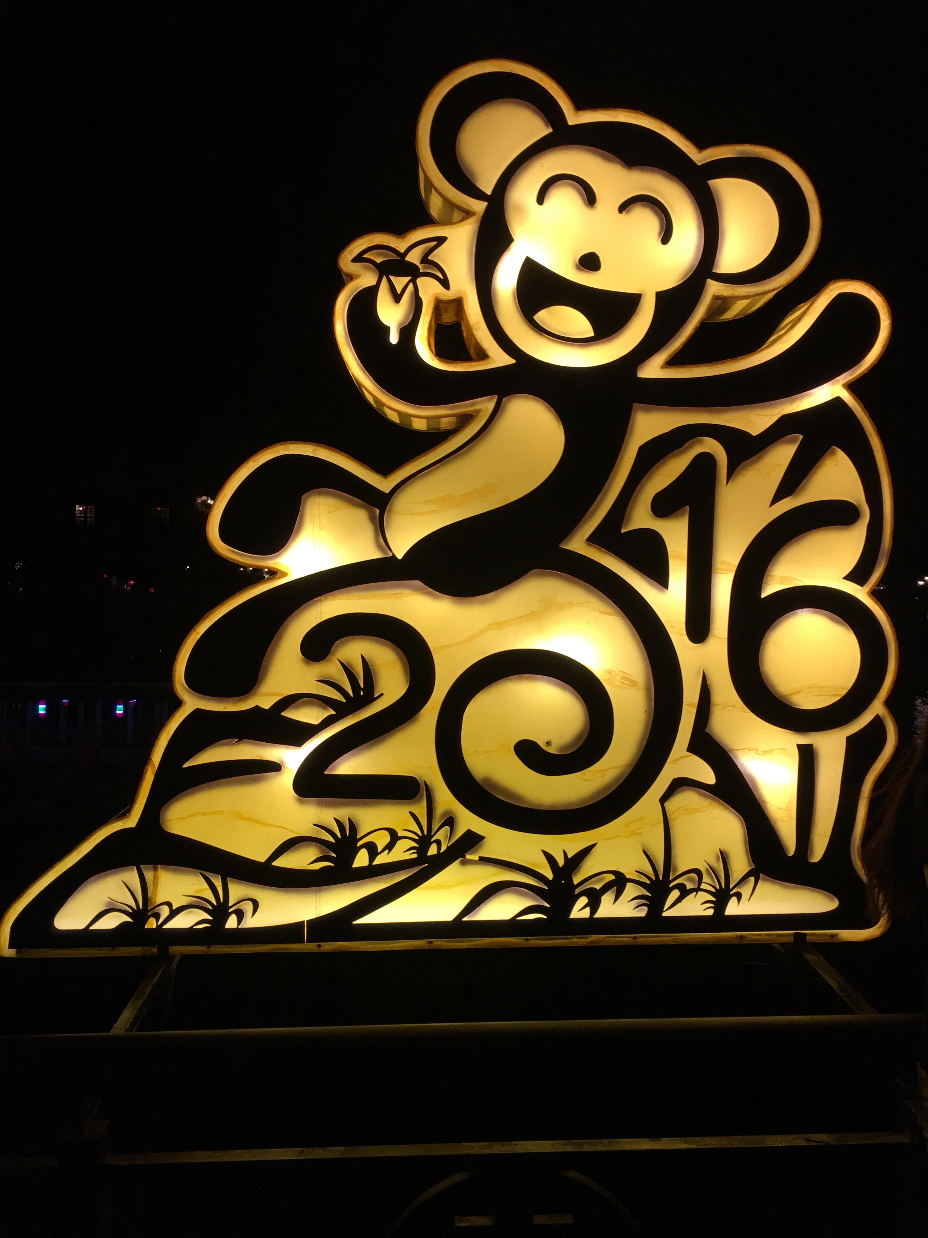 Walking along the river I decided to cross the people packed bridge. I was jostled and squished en route, but it was well worth it. A huge lit up 2016 monkey for Year of the monkey, a lit fish, and other marvels awaited me.